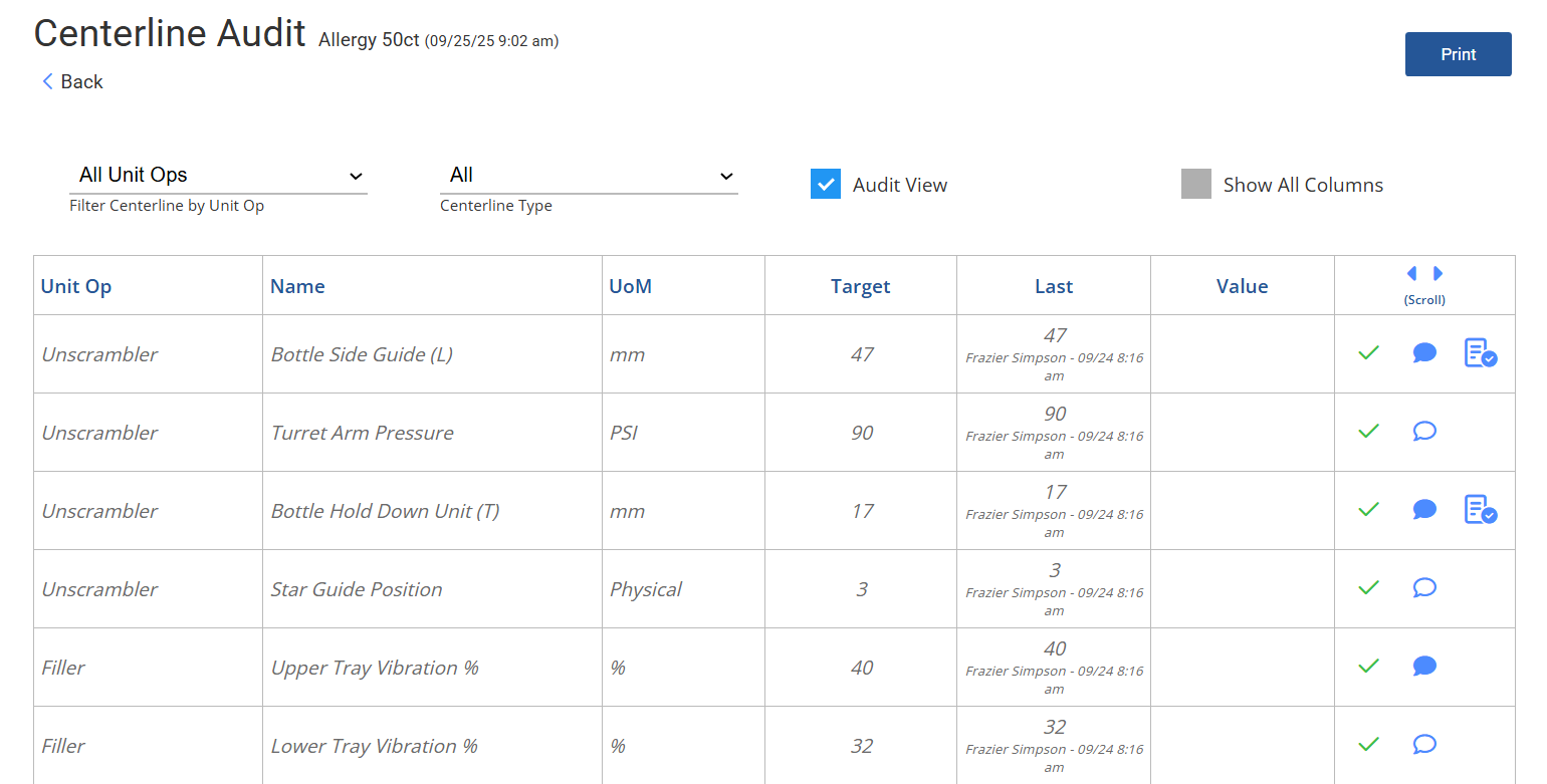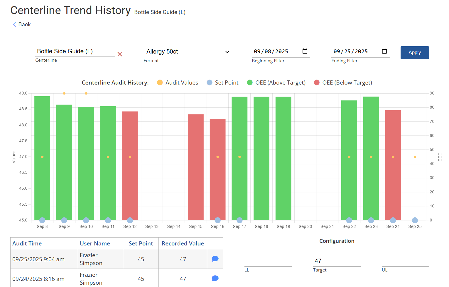 Trend histories compare actual audit values against targets and correlate them with performance, so teams know exactly where reliability starts to slip.
