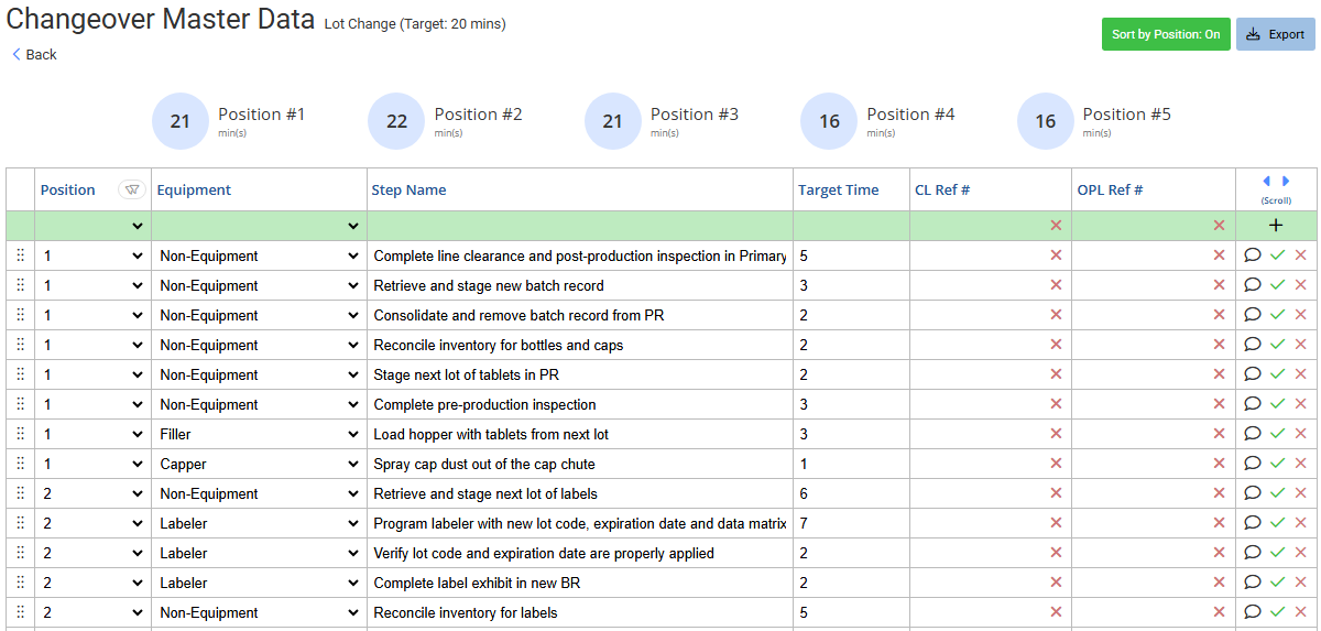 Task lists are balanced across positions and linked to setup standards, one-point lessons, and target times — ensuring efficient, repeatable changeovers every time.