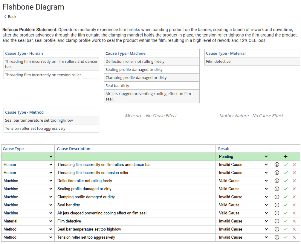 Problems repeat when they aren’t solved at the root. Plant Toolbox guides teams through a structured funnel of problem solving — starting with a clear problem definition, analyzing causes, and drilling down to the true root. Every investigation is linked to actions and results so improvements stick.