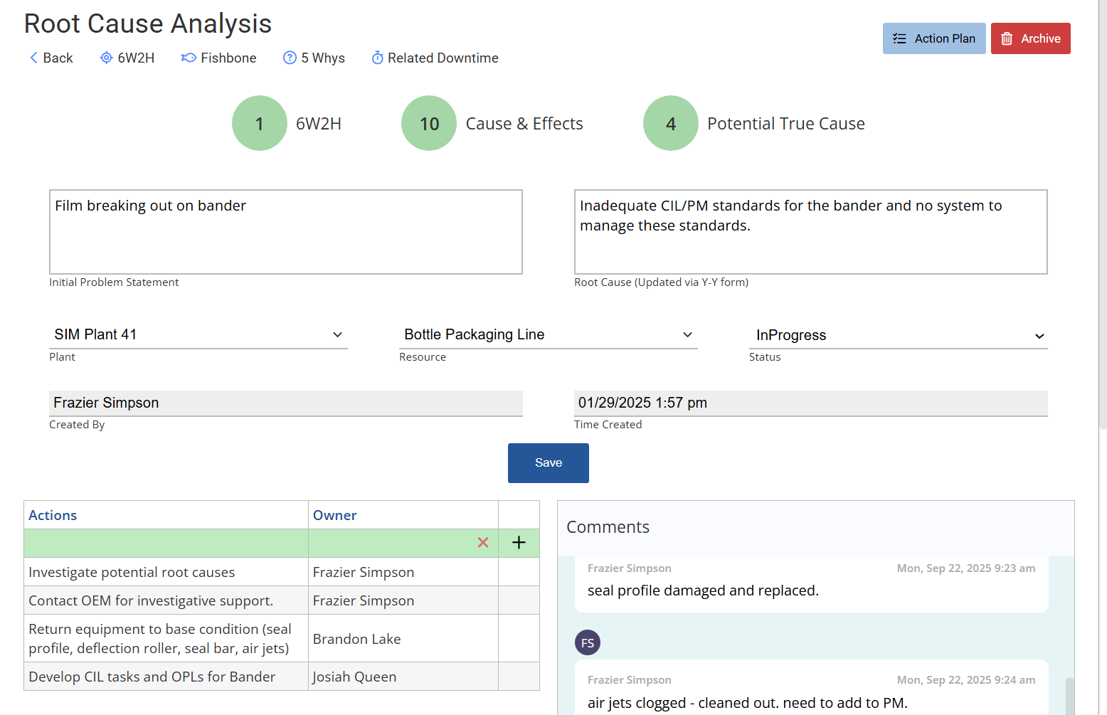 No more digging through old files, emails, or flip charts. The overview page captures everything in one place: problem statements, causes, validated root causes, actions taken, and comments made — accessible to anyone, anytime.