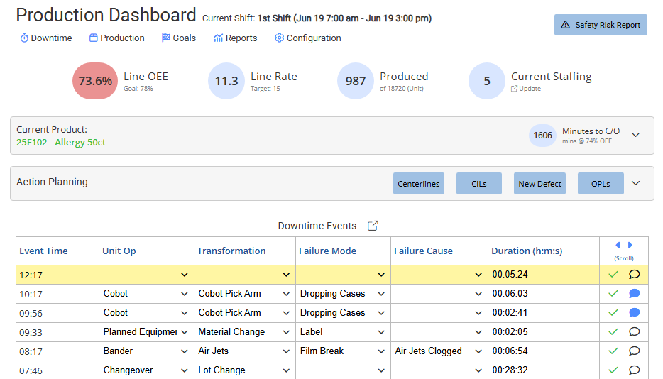 Operators see performance in real time: KPIs, production schedules, changeovers, downtime, and quick links to safety reporting and AM tools — all fed by live data.