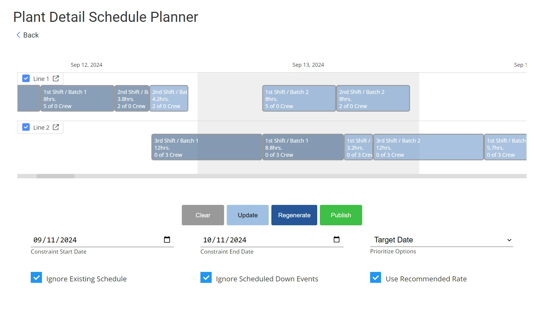 Visualize and update line schedules based on current constraints, product demand, shift patterns, and planned outages. Adjust in real time and regenerate forward-looking plans in seconds.